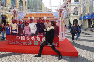 大三巴走下來就是議事庭前地,沿途附近都有很多好吃好逛的,其實我完全都沒有在注意。照片中是我和導遊的親密合照,她只負責媽祖廟和大三巴這段三個小時的重點行程導覽,在車上的同時她用非常專業的口氣向我們推薦「你們來澳門就是要多看秀,最精采的就是成人秀,晚上要看的舉手,我可以幫你們拿到好一點的價錢!」幾個智障成人舉手了,包含我在內。